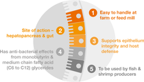 Its main active ingredients of monoglycerides of butyric, propionic, caproic are delivered via feed and are active throughout the intestine. By strengthening epithelium integrity, supporting host defense and fortifying the natural beneficial microbiota balance, BalanGut® AQ is a sustainable solution for achieving better resilience of aquaculture species, improving performance parameters under challenge conditions.